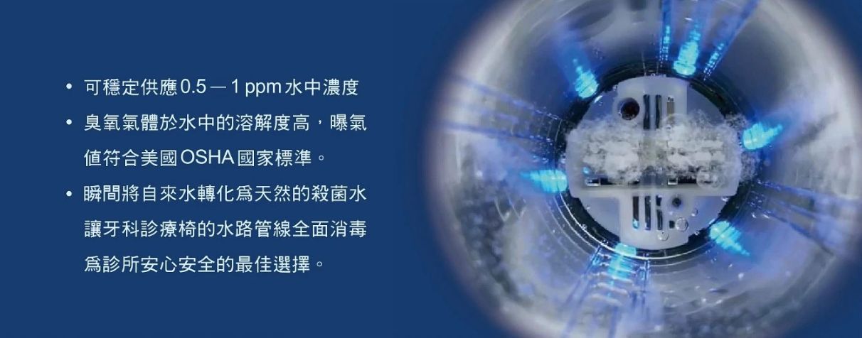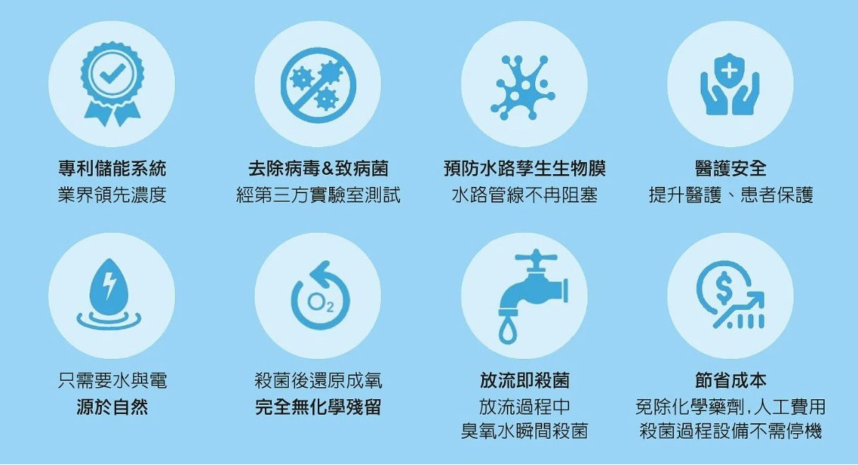 臭氧水為天然的強效殺菌劑,殺菌後立即還原成氧,過程中只需水與電,不需添加任何化學藥劑,所以無有害化學物質殘留;不影響水質酸鹼,更免除傳統臭氧造成設備氧化問題。