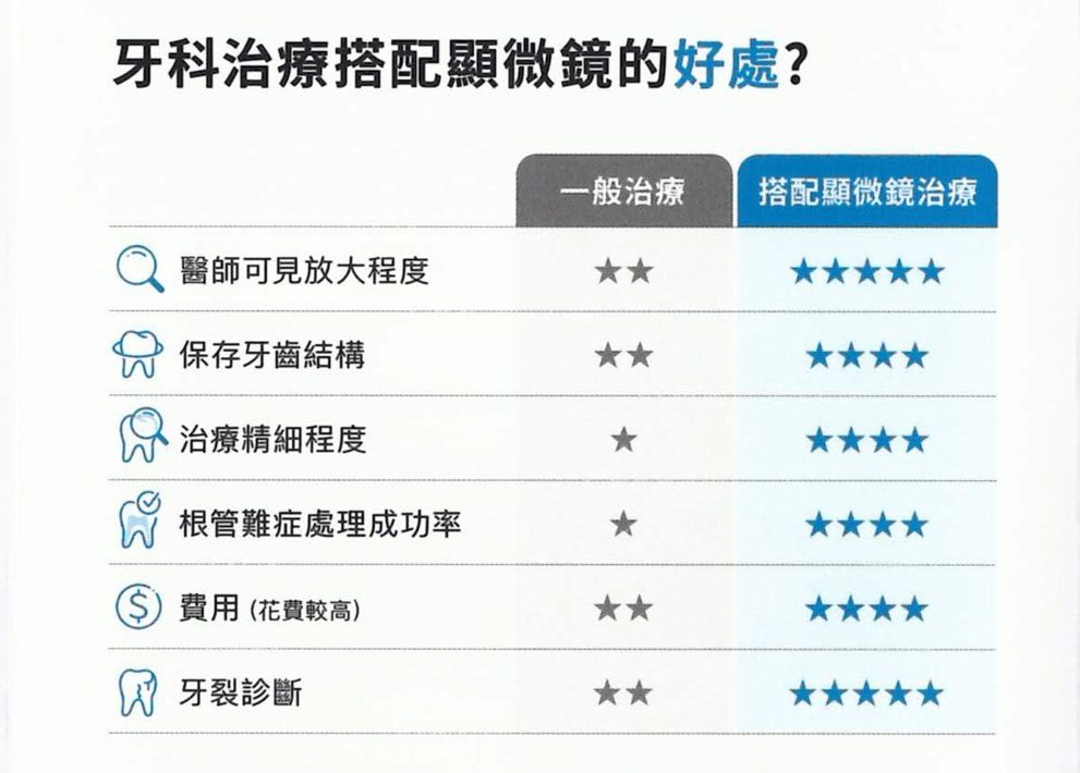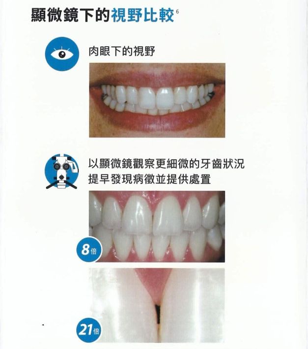 同時因為看得更清楚,可利用此特性來進行微創手術、顯微根管治療,保留更多健康的齒質,讓牙齒有機會能存活更久,縮短恢復時間,減少患者不適感,並能提供更精確的診斷與溝通。